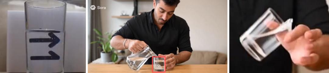 除了數(shù)手指,網(wǎng)友還開發(fā)出各種測(cè)試。比如模擬水倒入玻璃杯的場(chǎng)景、玻璃折射測(cè)試,還有魔術(shù)師將水倒入玻璃杯中,然后拿起玻璃杯并將其倒置,水不會(huì)流出。Sora 2 能輕松模擬水倒入玻璃杯的過程,包括反射、漣漪、折射,但也有瑕疵。比如模擬光的折射現(xiàn)象時(shí),向杯中倒水,朝左的箭頭變成朝右,箭頭還少了一點(diǎn);在經(jīng)典魔術(shù)場(chǎng)景中,杯中水像濺出來一樣,水中氣泡生成也不合理。