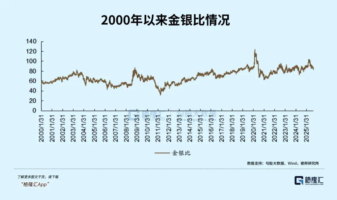 而白銀屬性更為復(fù)雜,資金涌入力度遠(yuǎn)不及黃金,最終導(dǎo)致金銀比被拉高。