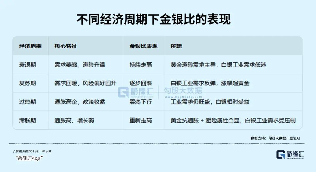 當(dāng)經(jīng)濟(jì)進(jìn)入復(fù)蘇階段,光伏、電子、新能源等行業(yè)需求擴(kuò)張,會直接拉動白銀的工業(yè)消費(fèi)需求。此時,白銀價格漲幅往往超過黃金,進(jìn)而導(dǎo)致金銀比回落。