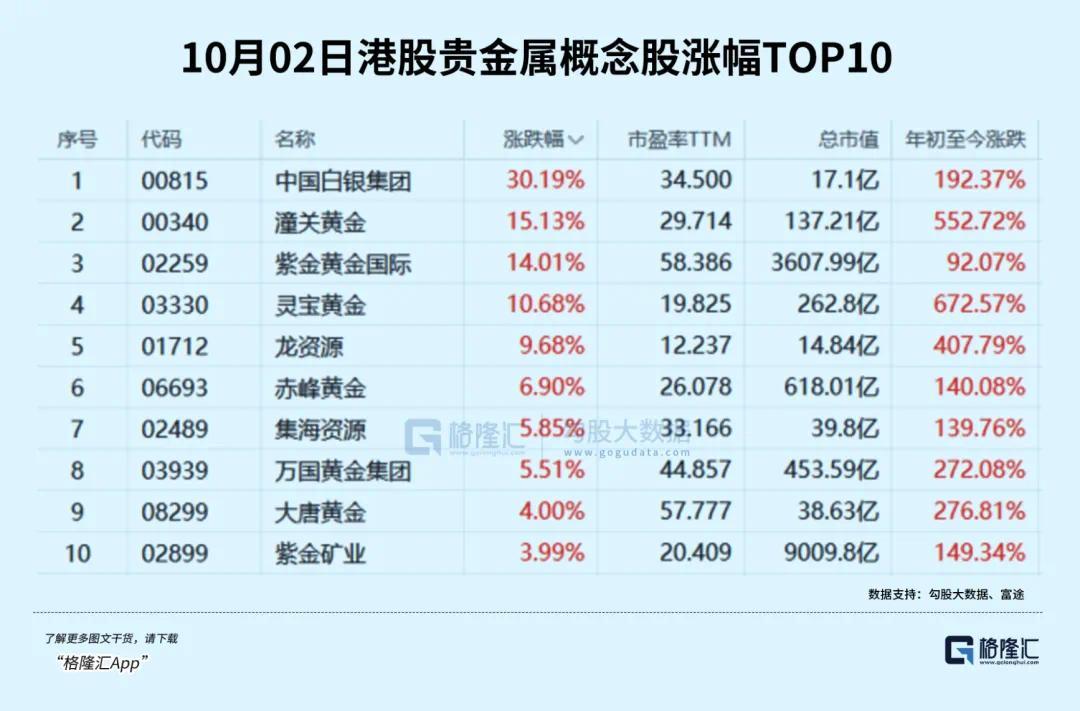 10月2日,港股國慶假期開市首日,貴金屬概念板塊全線飄紅,多只黃金股漲幅超過10%。其中,中國白銀集團(tuán)更是大漲30%,創(chuàng)下近4年以來的新高。