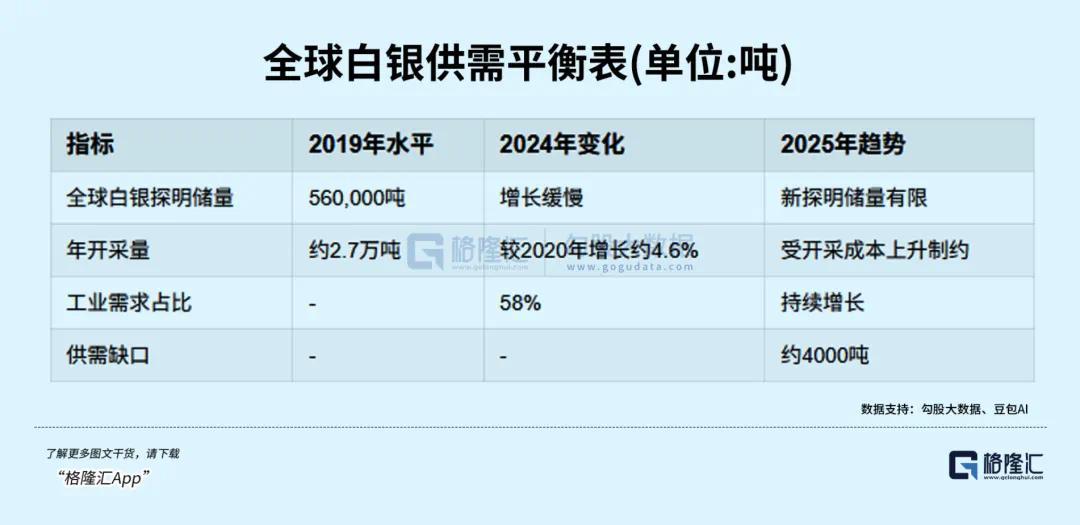 據(jù)報(bào)道,全球白銀已連續(xù)5年出現(xiàn)供給需求缺口,2025年測算顯示,全球白銀產(chǎn)量比消費(fèi)量少約4000噸。