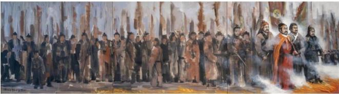 展覽現(xiàn)場(chǎng)展出37幅油畫精品及10幅水彩作品,其中油畫全景式展現(xiàn)了一百零八位水滸英雄的鮮明形象。中國(guó)美協(xié)會(huì)員趙溶以西方油畫的厚重肌理,融合中國(guó)寫意精神,重構(gòu)梁山一百零八將英雄圖譜,激活經(jīng)典魅力,讓觀眾觸摸經(jīng)典文學(xué)的英雄靈魂,實(shí)現(xiàn)藝術(shù)與文學(xué)的跨界對(duì)話。