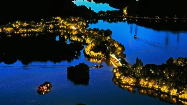 湘湖之畔,夜色溫柔如水。乘一葉扁舟滑入水波深處,橋洞下掠過暖黃的倒影,遠處城山禪寺的輪廓靜默,一時讓人分不清是船在畫中游,還是畫在景中走。