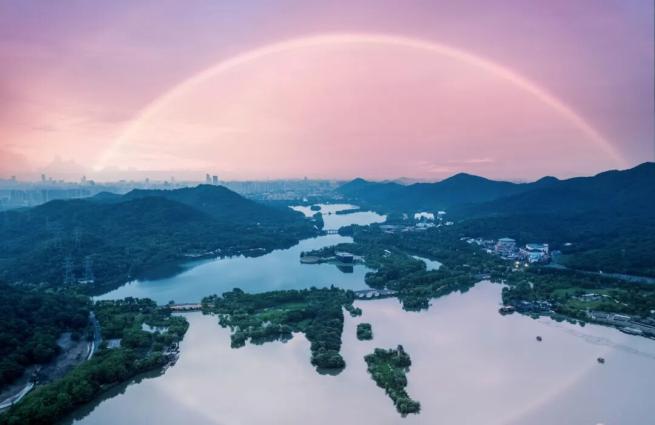 一場夏日雷雨,為喧囂的城市按下了片刻的暫停鍵。雨過天晴,彩虹如約而至,是天空贈予的雨后驚喜。錢江世紀公園里,花草的芬芳裹挾著泥土的清新?lián)涿娑鴣?,這正是屬于夏日里蕭山這座城市的一份爽朗。