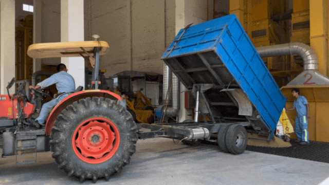 當(dāng)糧倉(cāng)裝滿后,稻谷會(huì)通過(guò)卸糧筒直接轉(zhuǎn)運(yùn)到稻田旁隨行的拖拉機(jī)中,然后運(yùn)往附近的外岡鎮(zhèn)糧食烘干中心。