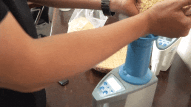 剛收割的稻谷含水量較高,容易發(fā)霉變質(zhì),不能直接進(jìn)行深加工。工作人員會(huì)使用谷物水分測(cè)定儀檢測(cè)稻谷的含水量,然后根據(jù)實(shí)際測(cè)量的含水率,設(shè)置合適的烘干溫度、時(shí)間和風(fēng)量等參數(shù)。