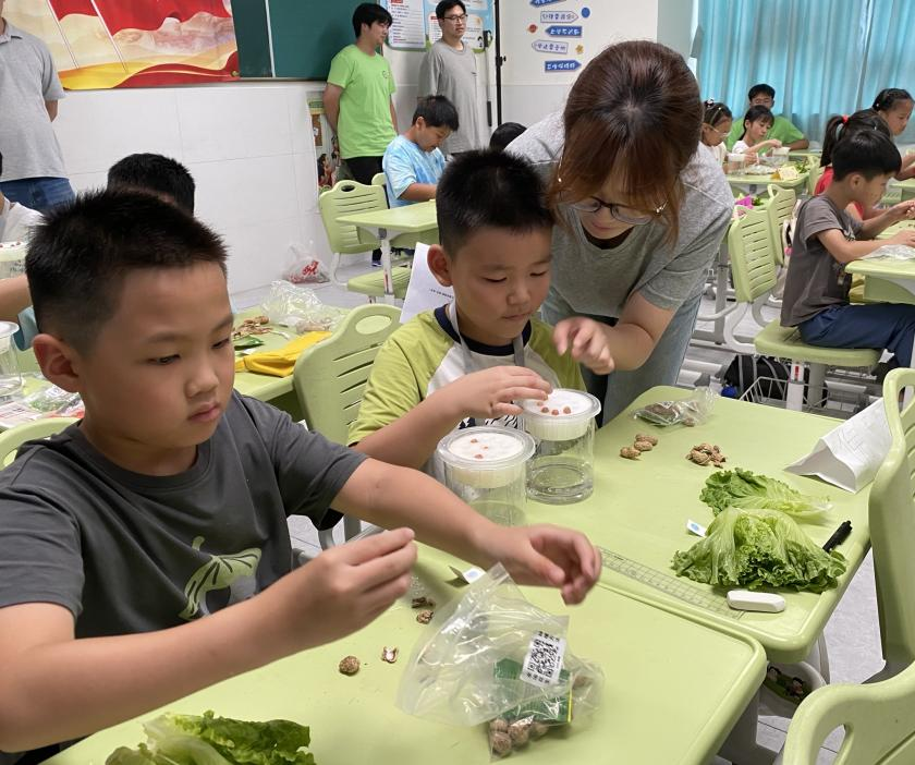 愛心暑托班的桃子課上,孩子們摸到了桃子絨毛。我們教大家掂重量、看果紋,小姑娘們把桃子捧在手心比臉蛋,男孩子爭當(dāng)“農(nóng)殘檢測小偵探”。做水培花生時,每個孩子收到透明培養(yǎng)瓶,鋪海綿、加清水,小心翼翼擺花生。一個男孩追問“老師,它會變成花生芽嗎?”不久我們收到學(xué)生照片,窗臺上花生冒出白芽,旁邊壓著觀察日記,畫著太陽和笑臉。那個扎雙馬尾的女孩說“等它長大了,我要摘給外婆煮鹽水花生?!迸囵B(yǎng)瓶在陽光下反光,我們感到小朋友把對田野的牽掛種進(jìn)了心里。