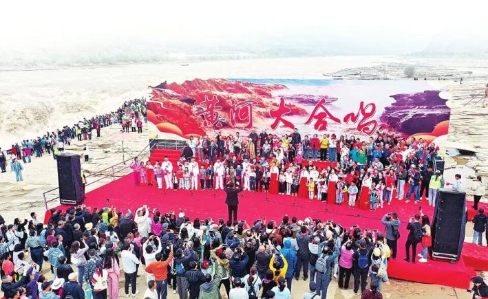 10月1日,游客們?cè)诩h黃河壺口瀑布景區(qū)一同高唱《黃河大合唱》,場(chǎng)面十分震撼。