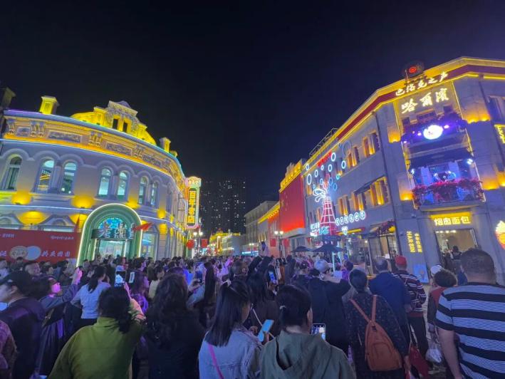 據(jù)了解,國慶前夕,道外區(qū)靖宇街與北三道街交口的“四百大樓”重新開業(yè)。這是一個(gè)復(fù)合型商業(yè)空間,樓頂有一座不停旋轉(zhuǎn)的黑膠唱片留聲機(jī)裝飾,還依托陽臺打造了“巴洛克之聲”舞臺。節(jié)日期間這里持續(xù)舉辦系列文化演出,一首首充滿家國情懷的歌曲引起了游客的共鳴,在這條以英雄名字命名的街道上,濃濃的愛國之情涌動、激蕩。