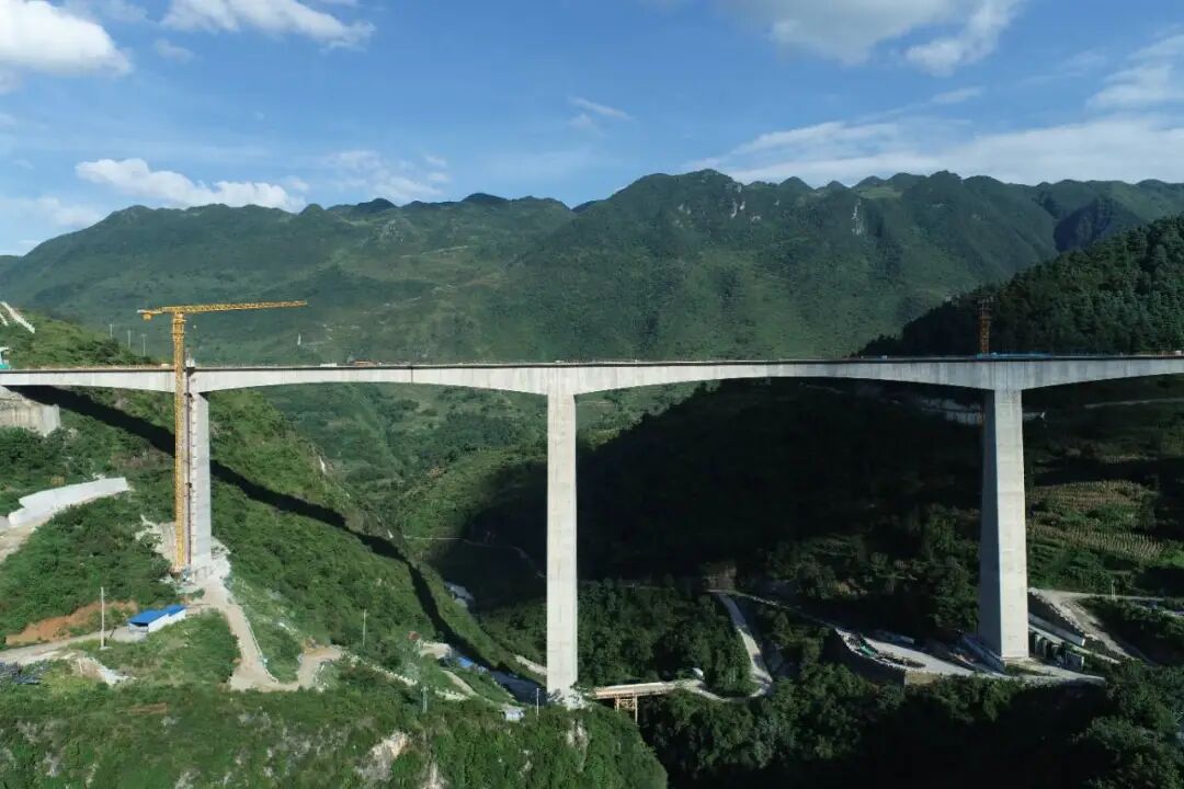 小龍?zhí)短卮髽蛭挥谝土伎h,全長770米,設(shè)計(jì)時(shí)速達(dá)350公里。主橋采用剛構(gòu)連續(xù)梁結(jié)構(gòu),最大跨徑為168米,最高橋墩有124米,“大跨高墩”特征明顯。而且,大橋橋址處于深切峽谷,兩岸地勢(shì)陡峭,地質(zhì)條件復(fù)雜,巖溶發(fā)育強(qiáng)烈,是全線施工難度最大的橋梁工程之一。