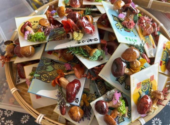 沿著滇池西岸的公路一路向南,西山區(qū)楊林港村的白族民居錯落有致,35歲的董芊汝正坐在自家小院的竹椅上,用銀線給剛烘干的牛肝菌標本描繪輪廓。她舉起作品對著陽光仔細觀察,竹籃里擺滿了扎染布藝包裹的菌菇擺件、印著白族甲馬紋樣的蘑菇冰箱貼,每一件都體現(xiàn)了自然與匠心的結(jié)合。