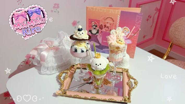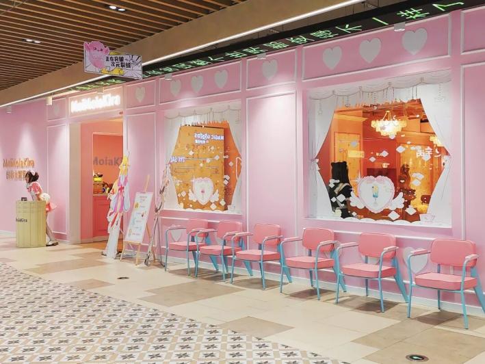 為了趕上和coser的互動(dòng),曹女士沒(méi)來(lái)得及吃午飯,她把目光投向身后不遠(yuǎn)處的咖啡店:這家名為“MoiMoiKira”的偶像主題餐廳開(kāi)業(yè)剛滿(mǎn)三周,整個(gè)店面被裝點(diǎn)成粉色,暖黃的燈光從玻璃透出。