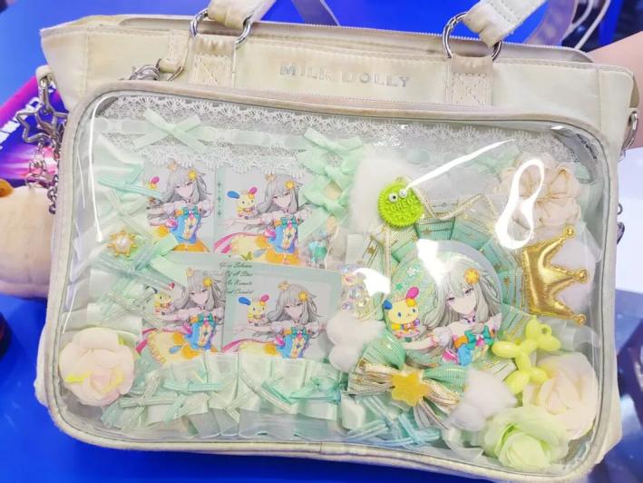早上10點(diǎn)半,快閃店剛開(kāi)門(mén),小嫣就遇到兩位購(gòu)買(mǎi)限定商品的女生?!拔液孟裨谒齻兩砩峡吹搅俗约?,對(duì)動(dòng)漫角色的喜愛(ài)是相似的?!睆那芭_(tái)抽屜里,小嫣拿出自己精心裝扮的小包,花朵、蕾絲和蝴蝶結(jié)圍繞著動(dòng)漫角色。