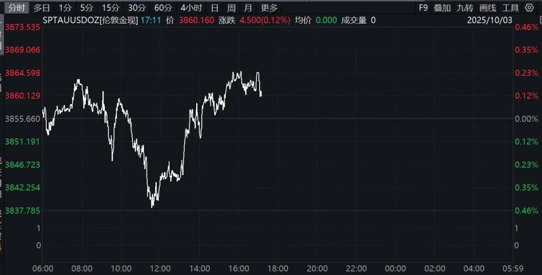 10月2日國際黃金創(chuàng)出歷史新高后有所回落,10月3日盤中,國際金價開始拉升并轉(zhuǎn)為上漲。截至發(fā)稿時,現(xiàn)貨黃金價格站上3860美元/盎司。與此同時,白銀價格大幅走高,紐約期銀漲幅一度擴大至2%,最新報價為47.22美元/盎司。