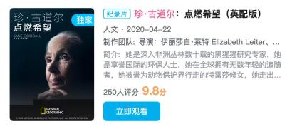 以此為名的紀(jì)錄片《珍·古道爾:點(diǎn)燃希望》(Jane Goodall: The Hope),曾在B站獲得9.8的高分。