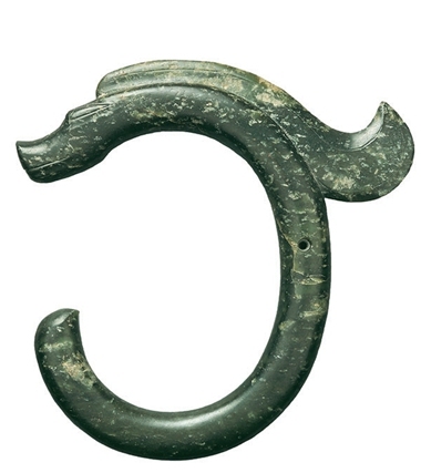 這件玉龍是中國(guó)發(fā)現(xiàn)的較早的龍形象之一,由墨綠色岫巖玉雕琢而成,周身光潔,大部素面無(wú)紋,額部及顎底刻有細(xì)密的方格網(wǎng)狀紋。它嘴緊閉,鼻端截平,以對(duì)稱的兩個(gè)圓洞為鼻孔。身體蜷曲呈“C”形,頭部長(zhǎng)吻修目,鬣鬃飛揚(yáng),尾部有力。玉龍脊背上有一圓孔,試驗(yàn)發(fā)現(xiàn),用繩子穿過(guò)圓孔將其懸掛起來(lái),龍的頭尾剛好處于同一水平線上。這件玉龍?jiān)O(shè)計(jì)巧妙,造型靈動(dòng),雕琢精美,藝術(shù)價(jià)值頗高。它是紅山文化玉器中體積最大、級(jí)別最高的,是中華龍文化、玉文化的重要象征,標(biāo)志著新石器時(shí)代西遼河上游地區(qū)對(duì)龍形象的崇拜。