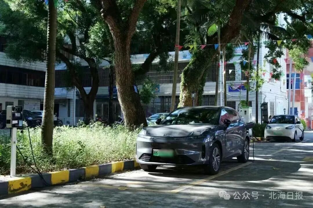 在北海市機(jī)關(guān)第二辦公區(qū)停車場內(nèi),游客在停車的同時(shí),為車輛充電。