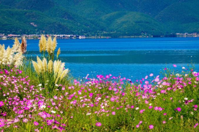 在云南省麗江市寧蒗彝族自治縣的瀘沽湖畔,大片格?;ㄕL(fēng)絢爛開(kāi)放。粉色的花朵嬌柔可愛(ài),白色的花朵清新雅致,紫色的花朵靜謐迷人。它們?nèi)缤粭l條彩帶,鋪展在湛藍(lán)的湖水和蒼翠的群山之間,把這片神秘之地裝點(diǎn)成了童話世界。