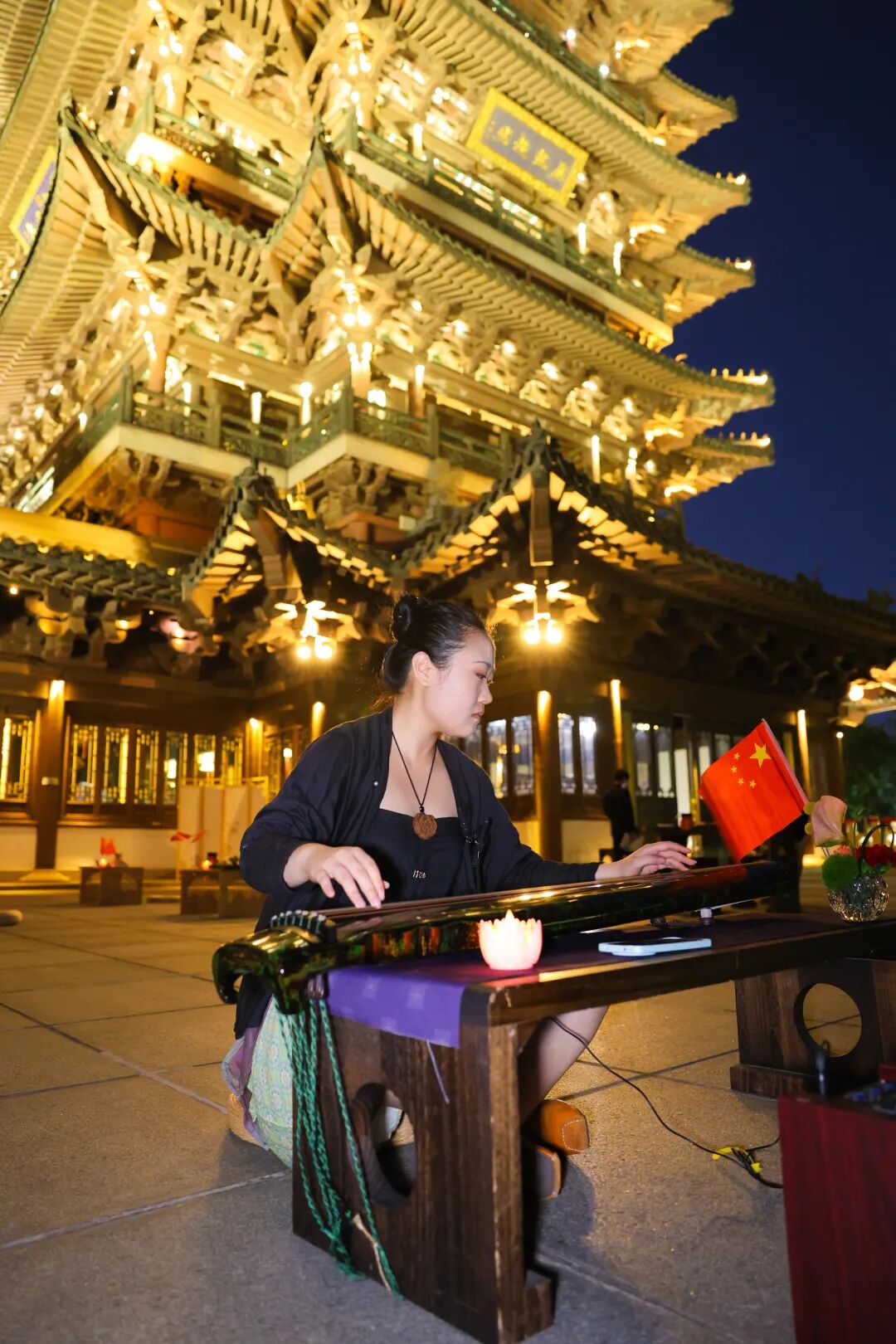 10月1日傍晚,微風(fēng)輕拂,超然樓三樓平臺首次開放,吸引了眾多游客前來打卡拍照。這里燈籠高懸,茶香四溢,悠揚的琴聲回蕩,成了古琴藝術(shù)的靈動舞臺。古琴演奏家劉東岳輕撫琴弦,音符如泉水般涌出?,F(xiàn)場琴音與秋風(fēng)交織,意境十足。