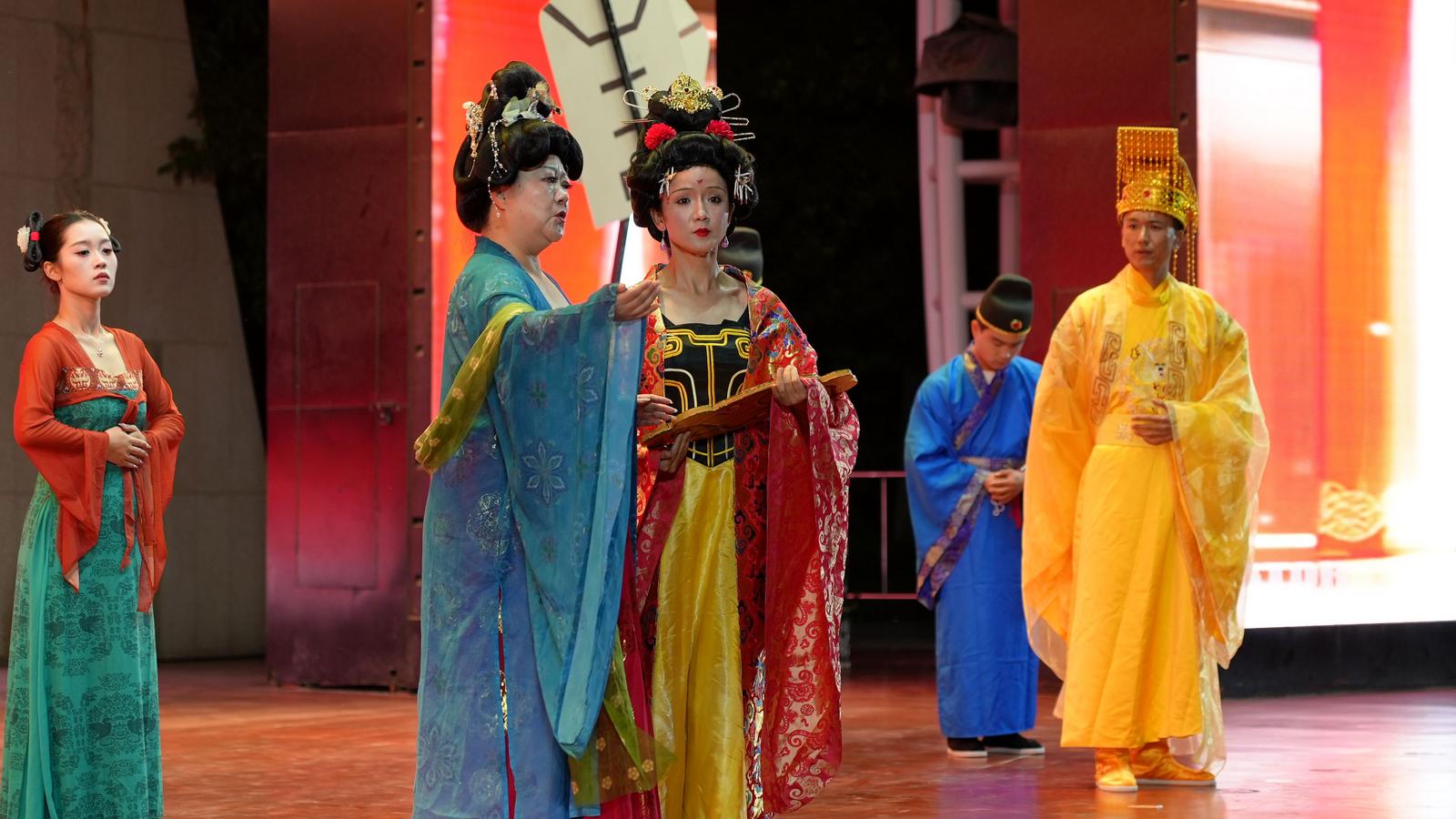 此次演出主要分為《絲路回響》情景劇和《恐龍足跡之謎》兒童劇兩部分,且這兩部劇均是首次登臺亮相。演出在《絲路回響》情景劇中正式拉開帷幕。該劇講述了7世紀(jì)初,松贊干布為學(xué)習(xí)唐文化向唐朝求親,唐太宗為穩(wěn)定邊疆同意了這一請求。隨后,唐太宗封宗室女為文成公主,讓她攜帶書籍、工匠等前往西藏。公主沿著絲路支線西行,在沿途傳播中原技藝,這一行程標(biāo)志著漢藏文化交流的開端。演出中還融入了非遺文化儺舞,讓更多鄉(xiāng)親深入了解了家鄉(xiāng)的文化瑰寶。