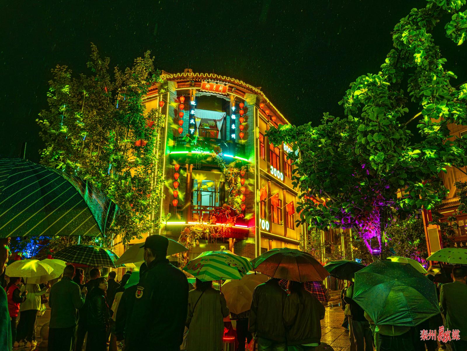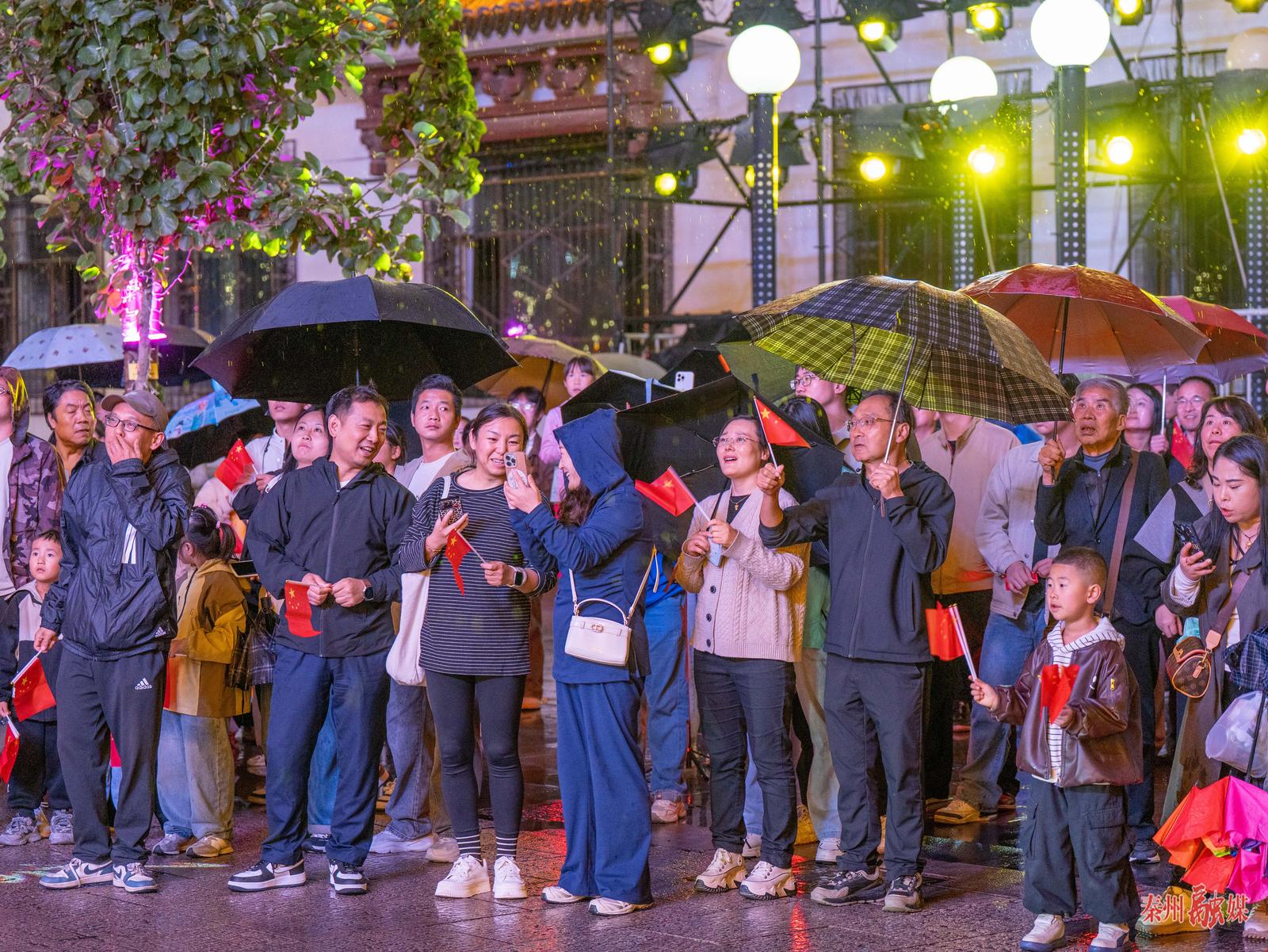 現(xiàn)場小雨淅瀝,燈光閃亮,增添了幾分浪漫?!段覑勰阒袊贰稛艋鹄锏闹袊返?0余首紅色經(jīng)典歌曲陸續(xù)唱響,演員們熱情澎湃,表達了對黨的熱愛和對祖國的祝福,也表達了對新中國76周年華誕的美好祝愿。銜月閣將連續(xù)演出八天,全方位提升游客旅游體驗,打造秦州文化旅游名片,以熱情姿態(tài)迎接游客。