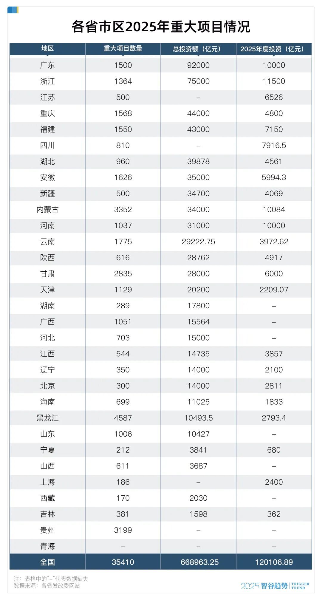 據(jù)智谷趨勢(shì)統(tǒng)計(jì),全國(guó)各省份(除港澳臺(tái)及青海外)公布的年度重大項(xiàng)目清單,數(shù)量多達(dá)約35410個(gè),規(guī)模遠(yuǎn)超以往。