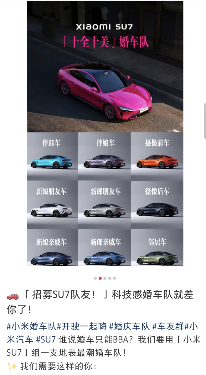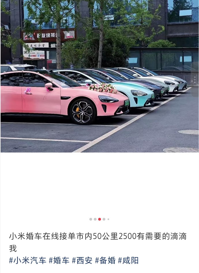 以小米SU7為例,社交媒體上有不少以“地名+小米SU7婚車隊(duì)”命名的賬號(hào)接單引流。
