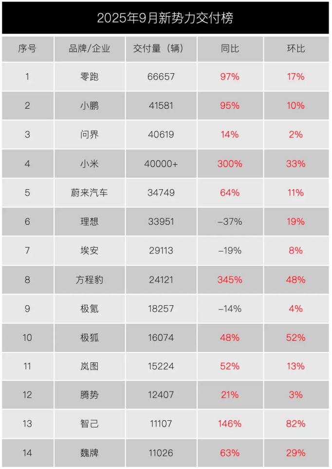 2025年9月新勢(shì)力品牌交付量榜單顯示,行業(yè)競(jìng)爭(zhēng)格局“頭部洗牌、黑馬狂奔、分化嚴(yán)重”。零跑汽車交付量超6.6萬(wàn)輛登頂,與小鵬、問(wèn)界、小米構(gòu)成月銷4萬(wàn)輛以上的頭部梯隊(duì)。不過(guò),傳統(tǒng)頭部品牌理想汽車同比下滑37%,極氪與埃安也分別出現(xiàn)14%和19%的同比負(fù)增長(zhǎng)。