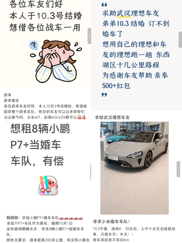 早在五六月,社交媒體上就有不少人發(fā)帖求國(guó)慶期間的新能源品牌婚車,如“各位車友們好,本人于10.3號(hào)結(jié)婚,想借各位戰(zhàn)車一用”等。
