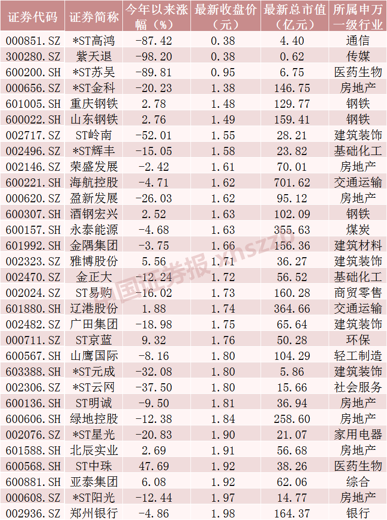 2元以下低價股僅余31只,今年多股漲幅超100%