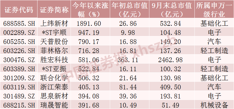 截至9月30日,今年以來漲幅最大的十只個股分別為上緯新材、*ST宇順、天普股份、菲林格爾、勝宏科技、*ST亞振、聯(lián)合化學、浙江榮泰、思泉新材、瑞晟智能,漲幅均超390%。
