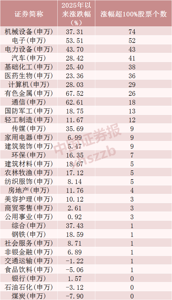 在446只漲幅超100%的股票中,機械設備、電子行業(yè)的股票最多,分別為74只、52只;電力設備、汽車、基礎化工、醫(yī)藥生物行業(yè)的股票均超30只;計算機、有色金屬行業(yè)的股票均超20只。這些牛股頻出的行業(yè)板塊,也是今年活躍的機器人、半導體、固態(tài)電池、DeepSeek等熱門概念股集中的板塊。