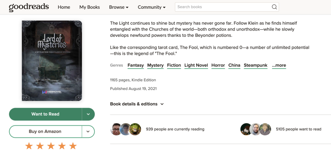 在有千萬注冊用戶的美國圖書界“大眾點評”Goodreads上,《詭秘之主》系列評分均在4.5以上(滿分5分),是絕對的高分。在內(nèi)容論壇Reddit上,海外粉絲熱情高漲,有人用第一個月工資買紙質(zhì)書,有人討論電影選角,還有人將其與《血源詛咒》聯(lián)系起來,進行學(xué)術(shù)剖析。