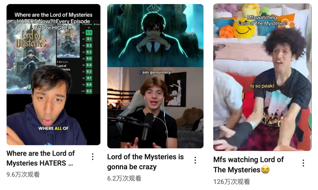 從6月28日全球上映到8月收官,《詭秘之主》動畫點燃了粉絲熱情,好評不斷:IMDb開分9.3,Crunchyroll評分4.9(滿分5分)、五星占比93%,叫好又叫座。在YouTube上,很多博主爭著看“生肉”,連劇透、“pathway解說”和“動畫觀看reaction”都有可觀的播放量。在Facebook、X、TikTok、Instagram、Reddit等社交媒體上,關(guān)于《詭秘之主》的討論也十分熱烈,梗圖、二創(chuàng)以及各種“what if”的交流掀起熱潮。