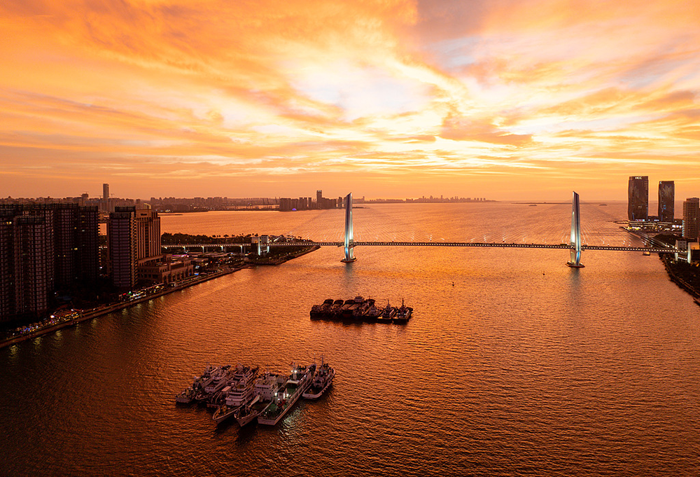 2025年10月4日傍晚,海南??冢硐加痴障碌氖兰o(jì)大橋。中新社記者 駱云飛 攝