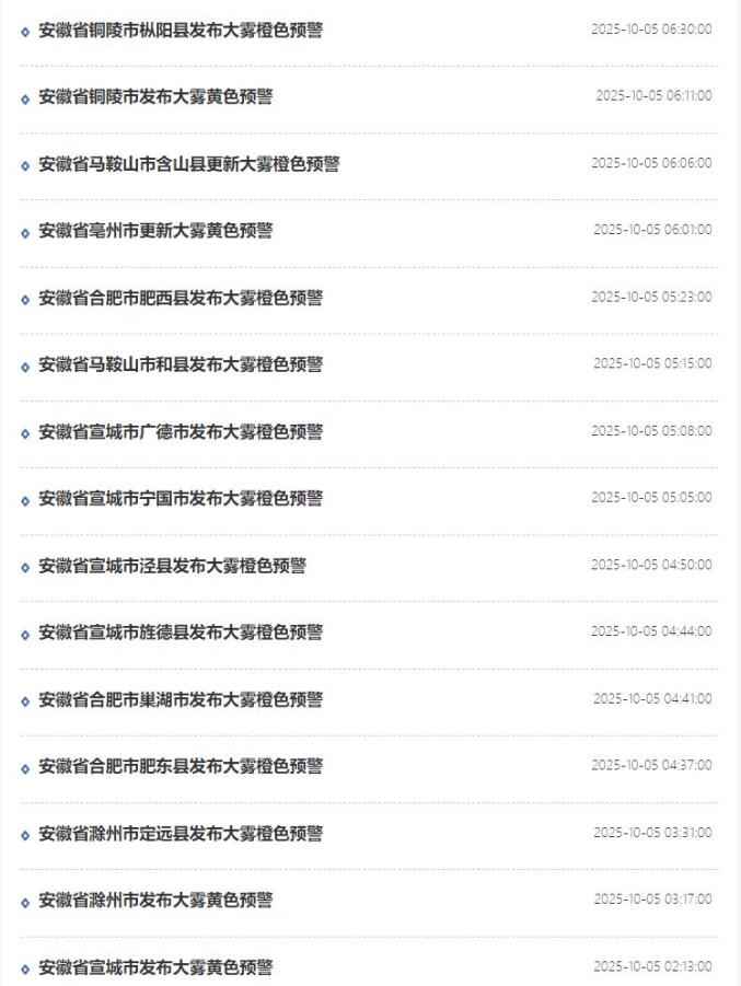 據(jù)國家應(yīng)急廣播顯示,安徽各地今晨已掛出15條預(yù)警信息,多地發(fā)布大霧橙色預(yù)警信號,部分地區(qū)已出現(xiàn)能見度小于200米的霧并將持續(xù)。