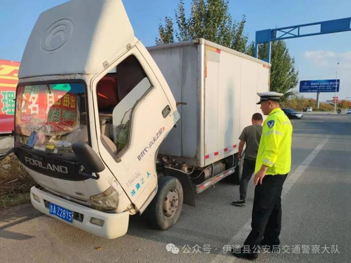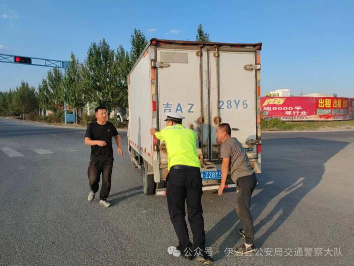 國慶佳節(jié),當(dāng)大家都沉浸在團(tuán)圓和出游的歡樂氛圍中時,伊通縣交警大隊的民輔警們卻堅守崗位,以那一抹“熒光綠”守護(hù)著群眾的出行安全。10月3日16時左右,長伊中線與九開線交匯處發(fā)生的暖心一幕,為這個假期增添了別樣的溫情。當(dāng)時,長伊中隊民警董恩奇帶著輔警于澤熙正在進(jìn)行日常巡邏。當(dāng)他們來到路口時,發(fā)現(xiàn)一輛牌照為吉AZ28Y5的小型箱貨停在了左轉(zhuǎn)車道中央,后方車輛排起了長隊,此起彼伏的喇叭聲透露出駕駛?cè)说慕辜?。箱貨駕駛員正蹲在車旁,滿臉無奈地來回查看。