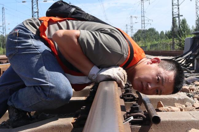 線路工的目光如同一雙“鷹眼”,精準辨別故障,緊盯鋼軌查找隱患,守護每一米線路安全。