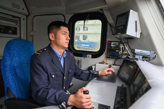 電力機車司機目光沉穩(wěn),精準把控重載列車的速度,確保列車準時高效運行。