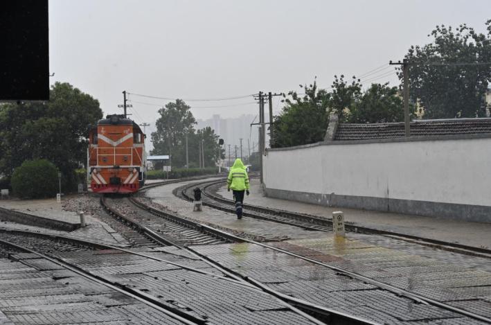 ▲ 國慶中秋假期,陰雨連綿,鄭州北車站下行編組場身著防護服的“小黃人”冒雨穿梭在股道間。