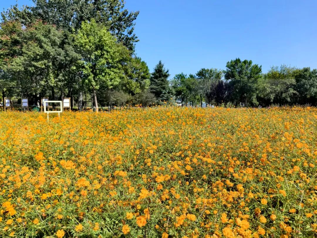 植物園香草園的初秋,是色彩的狂歡。近2萬(wàn)平方米的花田內(nèi),硫華菊橙紅似火,百日草繽紛奪目,波斯菊輕盈搖曳。三種花卉相互交織,形成一片廣袤的“自然調(diào)色板”,規(guī)模宏大且細(xì)節(jié)豐富。