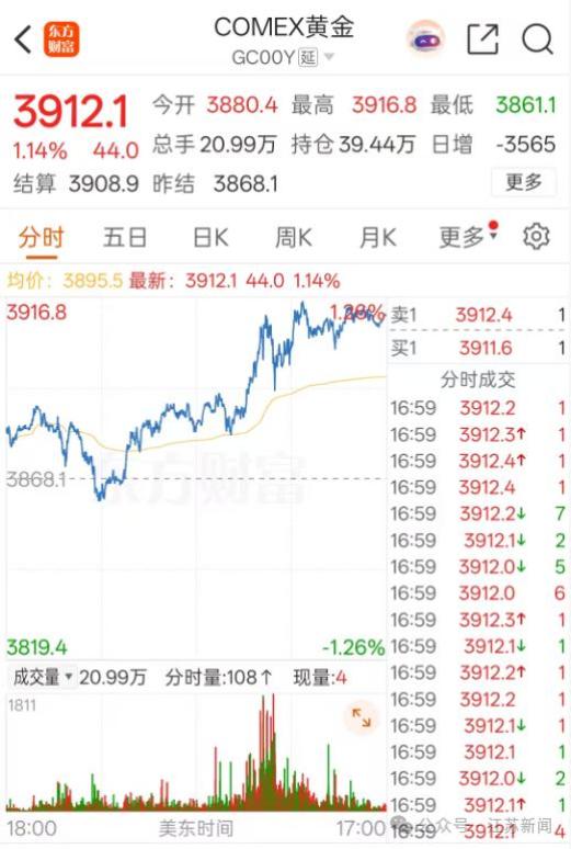 據(jù)媒體10月4日消息,COMEX黃金期貨收漲1.14%,報3912.1美元/盎司。本周五,國際金價再創(chuàng)收盤歷史新高,紐約商品交易所12月黃金期價收于每盎司3908.90美元,漲幅為1.05%。此外,本周國際金價前三日連續(xù)創(chuàng)下盤中歷史新高,一周累計上漲3.23%。COMEX白銀期貨收漲3.45%,報47.97美元/盎司,本周累計上漲3.46%。