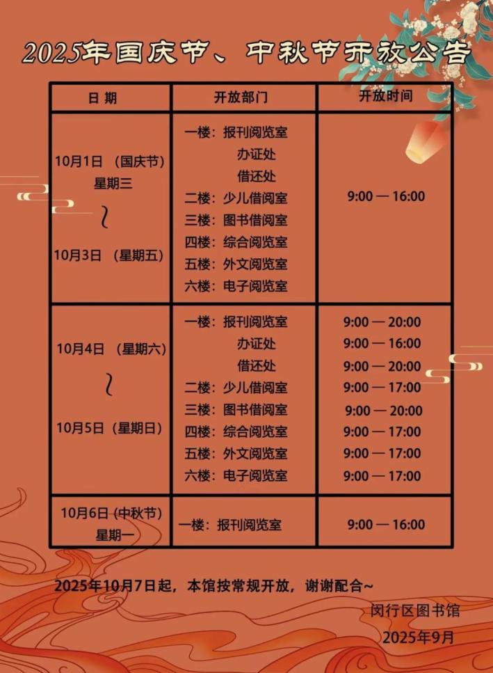 告別商圈的熱鬧喧囂,近在咫尺的閔行區(qū)圖書館為居民提供了一片靜謐之地,居民可在此開啟沉浸式閱讀,讓思緒在古今中外暢游。前往時,可結(jié)合閔行區(qū)圖書館國慶節(jié)、中秋節(jié)開放安排合理規(guī)劃時間。(閔行區(qū)圖書館2025年中秋節(jié)、國慶節(jié)開放公告)