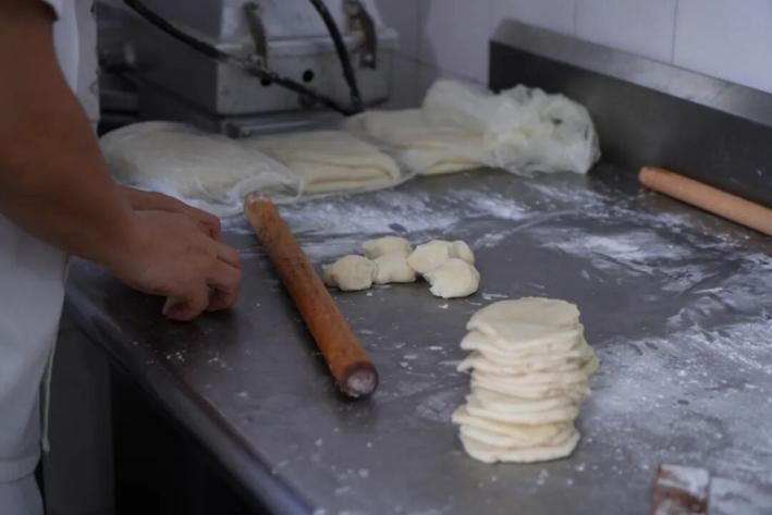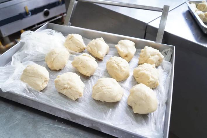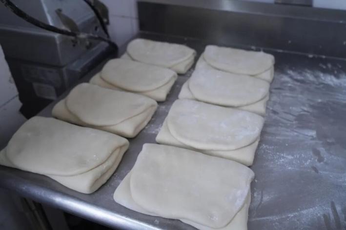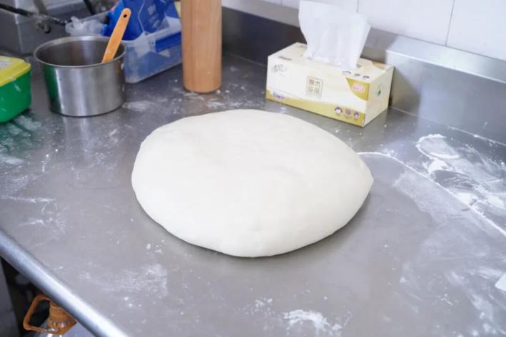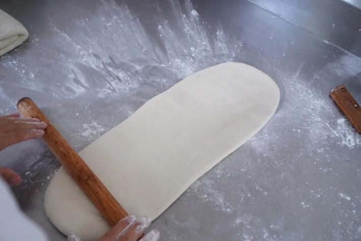第2步:稱好水油面和油酥面,把油酥包進(jìn)水油面中,揉成團(tuán)后搟成長(zhǎng)條狀牛舌片,再卷起來(lái)。