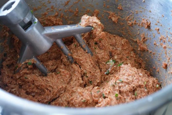第4步:在剁好的肉餡中加入雞蛋、生抽、老抽、料酒、香油、鹽、糖和胡椒粉,沿同一方向攪拌,讓肉餡和湯汁充分融合。接著倒入蔥姜水,再加入蔥末,繼續(xù)攪打,直到肉餡上勁呈黏稠狀。