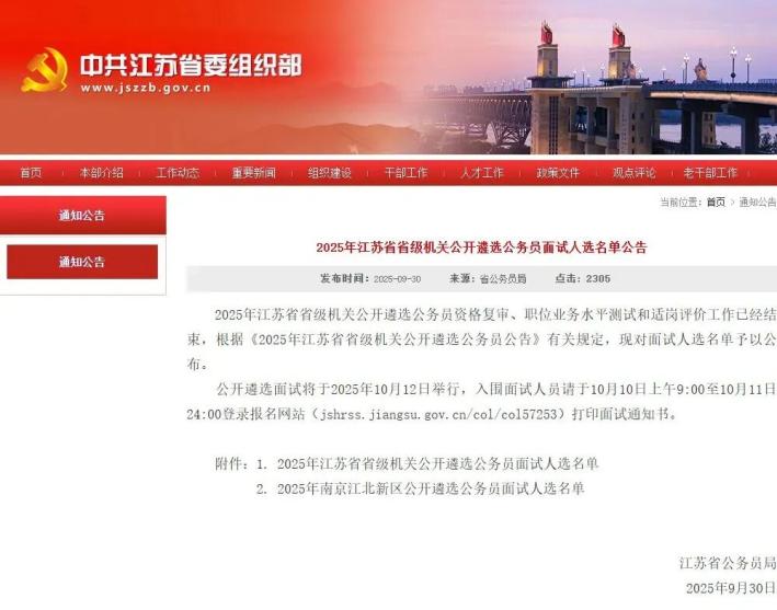 公開(kāi)遴選面試將于2025年10月12日舉行。入圍面試的人員需在10月10日上午9:00至10月11日24:00期間,登錄報(bào)名網(wǎng)站(jshrss.jiangsu.gov.cn/col/col57253)打印面試通知書。