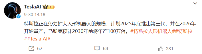 9月30日,“TeslaAI”發(fā)文稱,特斯拉正努力擴(kuò)大人形機(jī)器人規(guī)模,計劃2025年底推出第三代,2026年開始量產(chǎn)。馬斯克預(yù)計2030年前年產(chǎn)100萬臺。