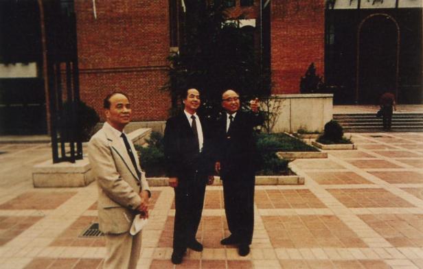 1994年倪維斗(左一)與李政道、張孝文在清華大學(xué)新圖書館前