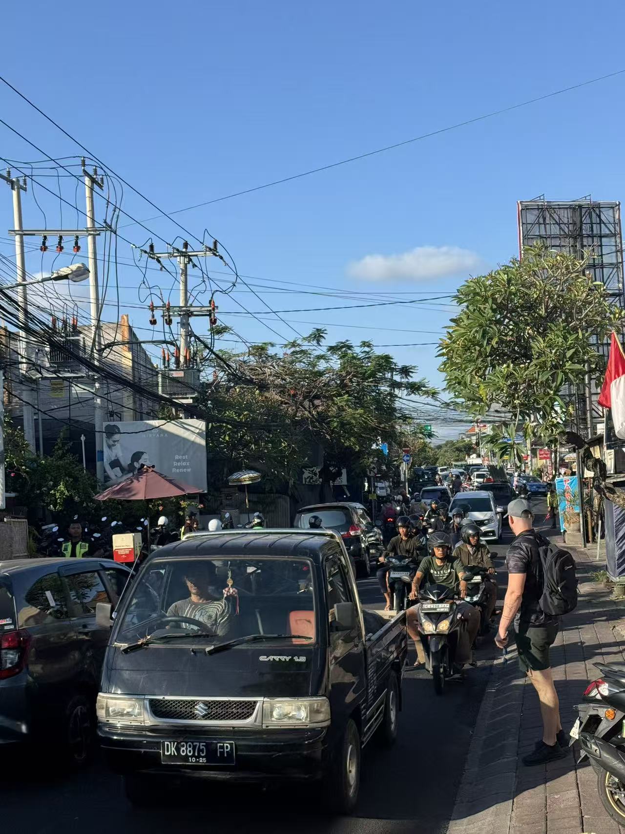 雖然摩托車很多,但當(dāng)?shù)伛{駛文化有序。人人戴頭盔,車速快但會(huì)規(guī)范打燈、禮讓行人。此外,巴厘島有特色職業(yè),大商店或公共場(chǎng)所門口有保安攔車引導(dǎo),路邊也有人幫忙攔車、指揮停車,每次收費(fèi)2000印尼盾,約合人民幣一元。