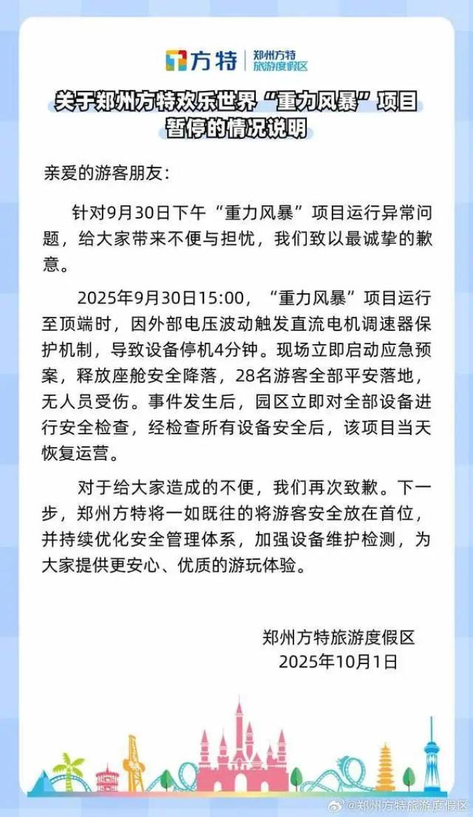 對(duì)此,鄭州方特旅游度假區(qū)發(fā)布了相關(guān)情況說明?!爸亓︼L(fēng)暴”項(xiàng)目運(yùn)行至頂端時(shí),因外部電壓波動(dòng)觸發(fā)了直流電機(jī)調(diào)速器保護(hù)機(jī)制,導(dǎo)致設(shè)備停機(jī)4分鐘?,F(xiàn)場立即啟動(dòng)應(yīng)急預(yù)案,釋放座艙安全降落,28名游客全部平安落地,無人員受傷。